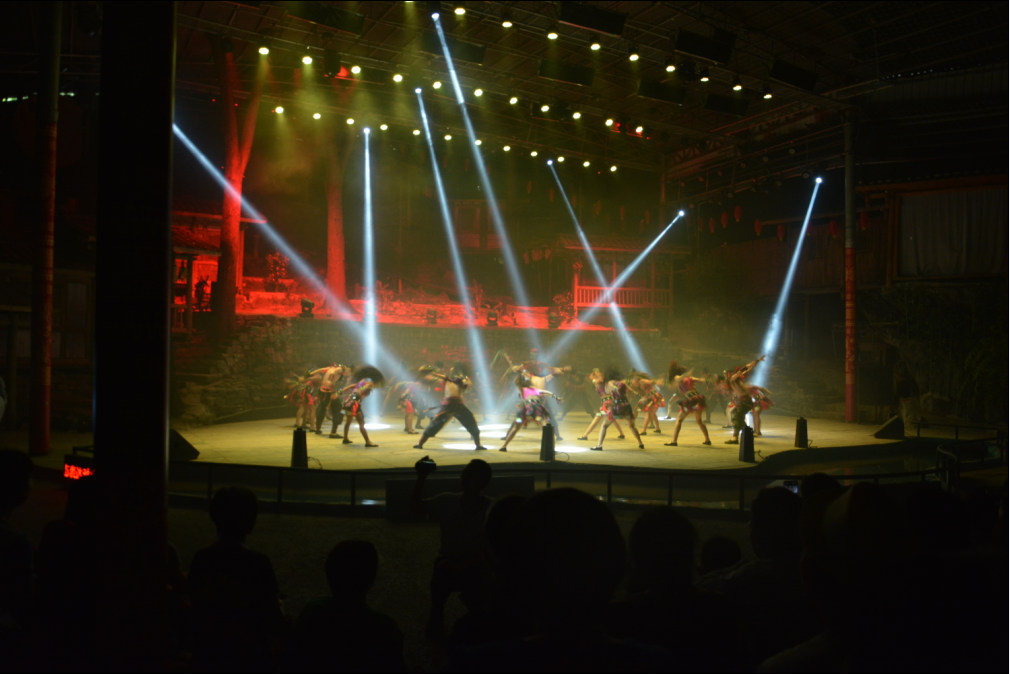 【漓水古越】是以展示廣西少數(shù)民族民俗風(fēng)情為主題的大型民族表演,它集漓江山水、廣西少數(shù)民族文化及現(xiàn)代藝術(shù)創(chuàng)作,選用"真山真水"做為實景舞臺。 展現(xiàn)出了少數(shù)民族的"銅鑼文化""繡球文化" "山歌文化"等多種文化的表演。